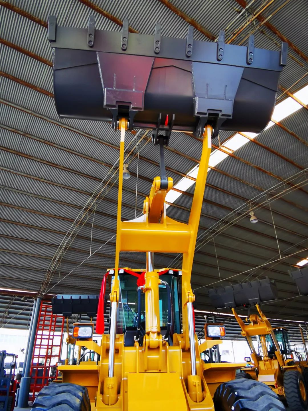 2、立式油缸工作裝置布局,高位提升力大,滿(mǎn)斗裝車(chē)效率高,更適用于裝卸和起吊作業(yè)工況。
