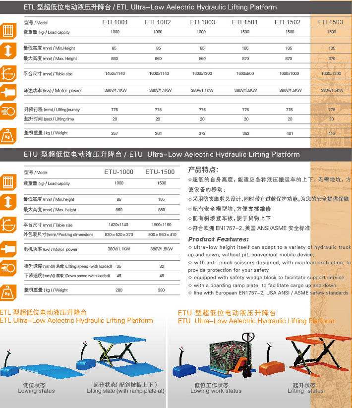 超低的自身高度,能適應(yīng)各種液壓搬運車的上下,無需地坑,方便設(shè)備的移動;