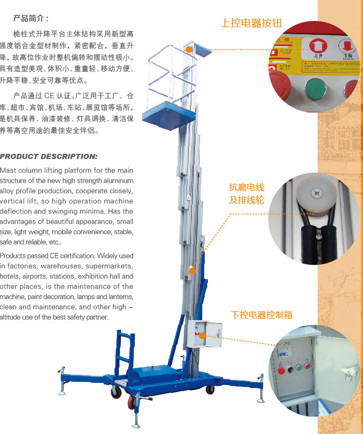 桅柱式升降平臺(tái)主體結(jié)構(gòu)采用新型高強(qiáng)度鋁合金型材制作,緊密配合,垂直升降,故高位作業(yè)時(shí)整機(jī)偏轉(zhuǎn)和擺性極小。具有造型美觀、體積小、重量輕、移動(dòng)方便、升降平穩(wěn)、安全可靠等優(yōu)點(diǎn)。